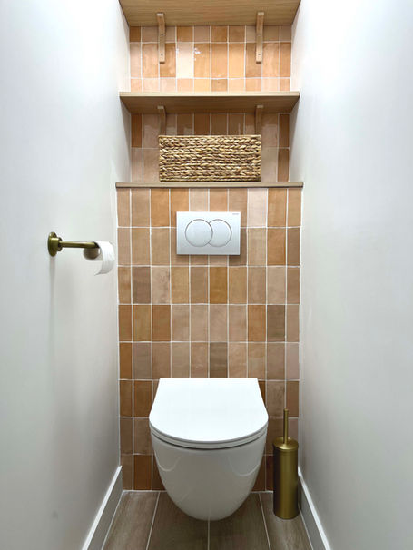 Entièrement repensé et aménagé dans le détail, les espaces ont été délimités par la peinture et par le sol comme ce tapis en carrelage aspect Terrazzo.